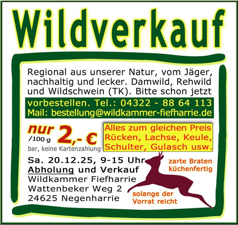 Mail: bestellung@wildkammer-fiefharrie.de, Tel. : 04322 - 88 64 113 Inhaber: Jagdaufseher Rüdiger Marquardt, Wattenbeker Weg 2, 24625 Negenharrie Impressum / Datenschutz , USt-IdNr: DE233384439